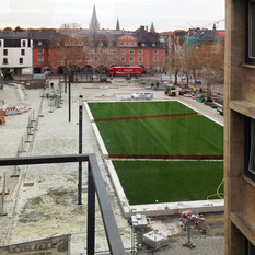 Die Bauarbeiten auf dem Konrad-Adenauer-Platz in Gütersloh gehen gut voran: der "fliegende Teppich" aus Rollrasen gibt dem spätherbstlichen Platz einen grünen Anstrich