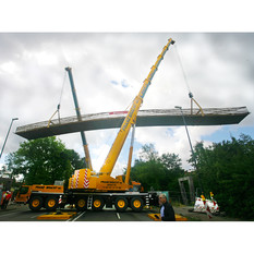 Das erste - und größte - Segment der barrierefreien Fuß- und Radwegbrücke über die B61 und über die Dalke in Gütersloh wurde in Millimieterarbeit erfolgreich montiert. Ein aufregender Moment!